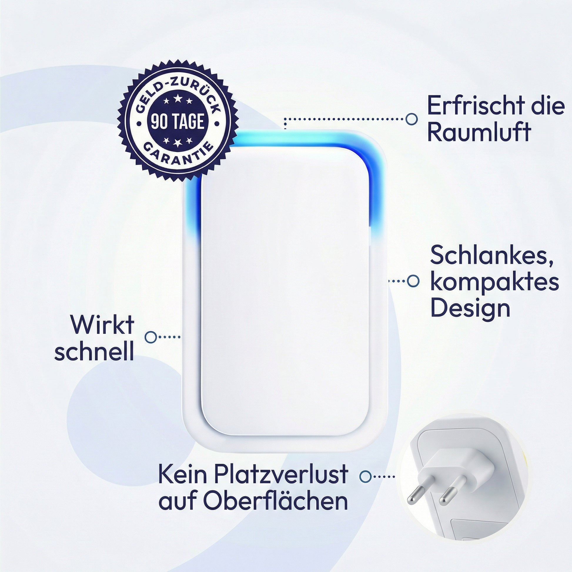 Laite ei käytä kemikaaleja eikä sisällä säteilyä. Se toimii ilman suodattimia ja on tarkoitettu jatkuvaan, huomaamattomaan käyttöön.